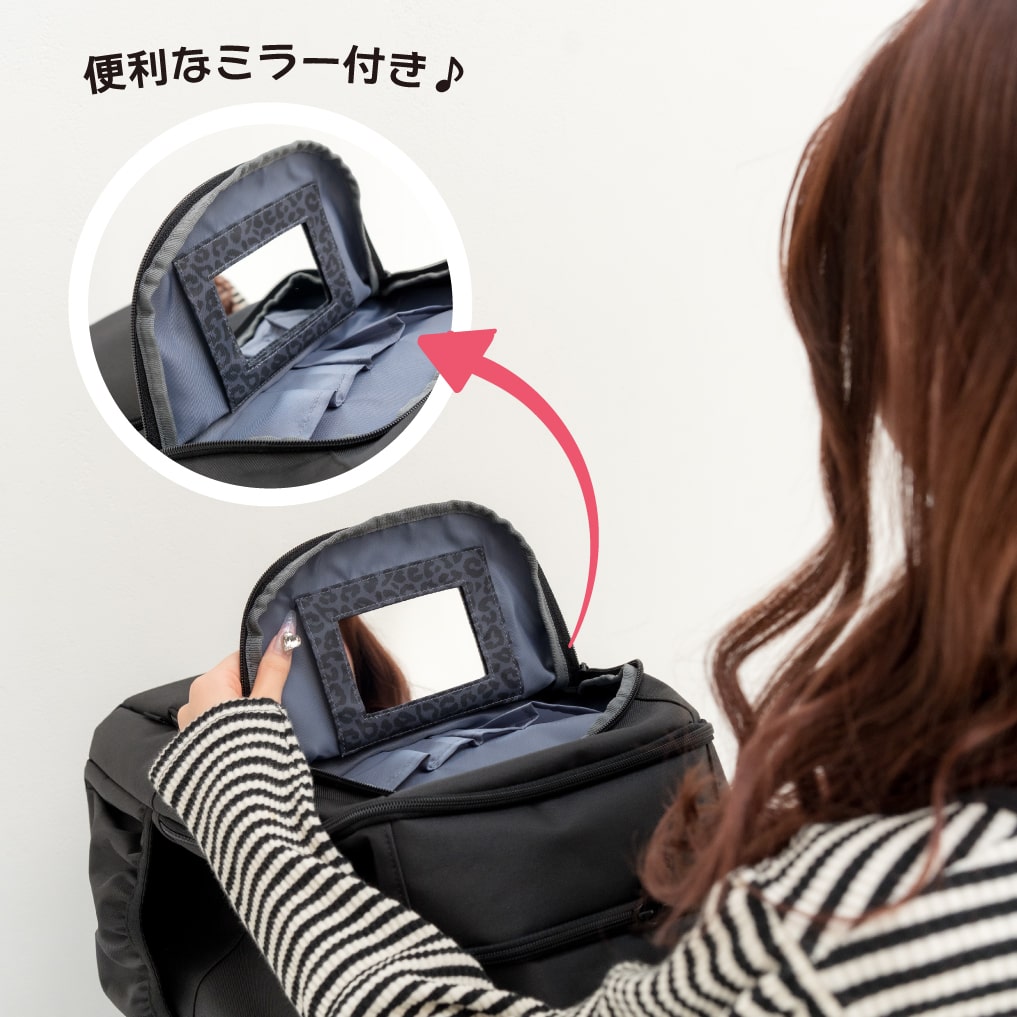 大きく開くメインコンパートメントのほか、ミラー付きのフロントポケット、ラップトップスリーブなど充実した収納力。
