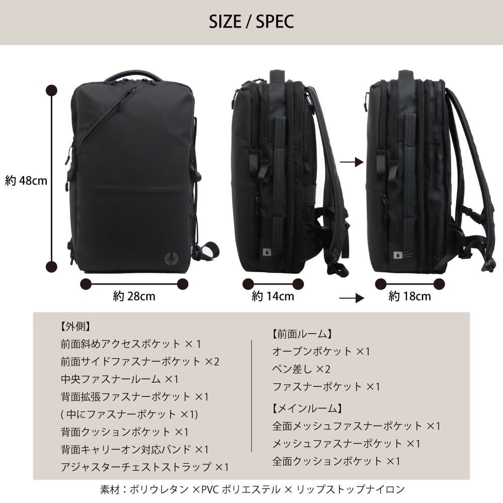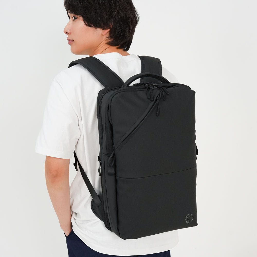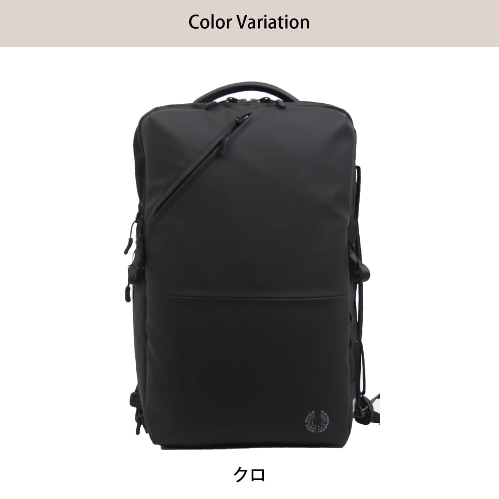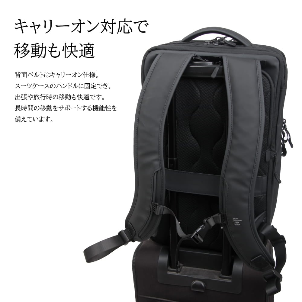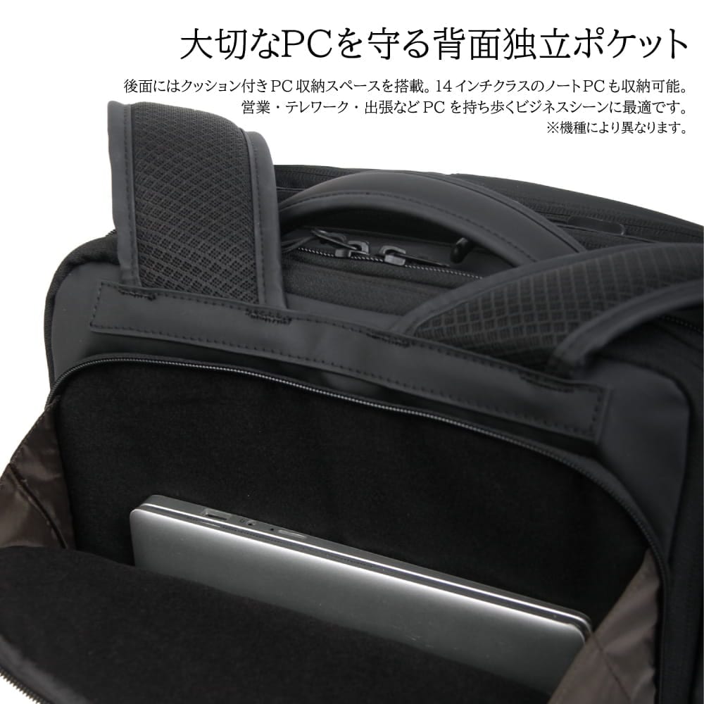 二層式ファスナー仕様で収納スペースはそれぞれ独立。書類や小物を整理しやすいポケットに加え、PC対応のクッションポケットも完備しています。背負えるキャリーケースのような機能性を備え、日常の通勤から出張・旅行まで幅広いシーンで活躍するビジネスリュックです。