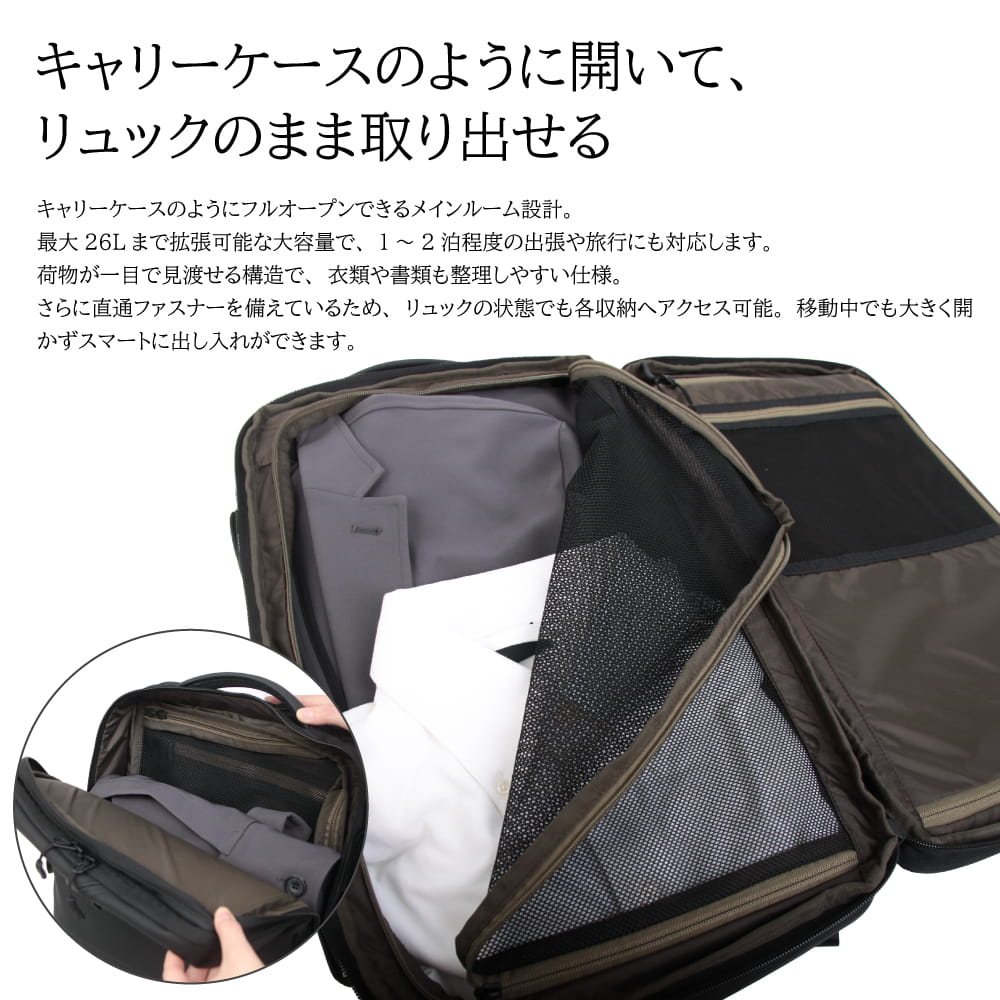メインルームはキャリーバッグのように大きく開く構造で、書類はもちろん衣類も収納可能。出張や旅行にも対応する大容量設計です。ファスナー開閉によりマチ幅を調整でき、19Lから最大26Lまで容量を拡張可能。荷物の量に合わせて柔軟にお使いいただけます。
