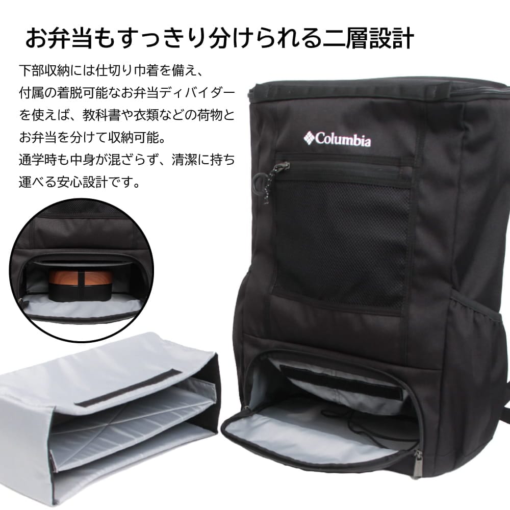 下部収納スペースには仕切り巾着を備え、付属の着脱可能なお弁当ディバイダーを使用することで、荷物とお弁当を分けて収納可能。下部収納へ直接アクセスできるファスナーポケット付きで、必要な物をスムーズに取り出せます。