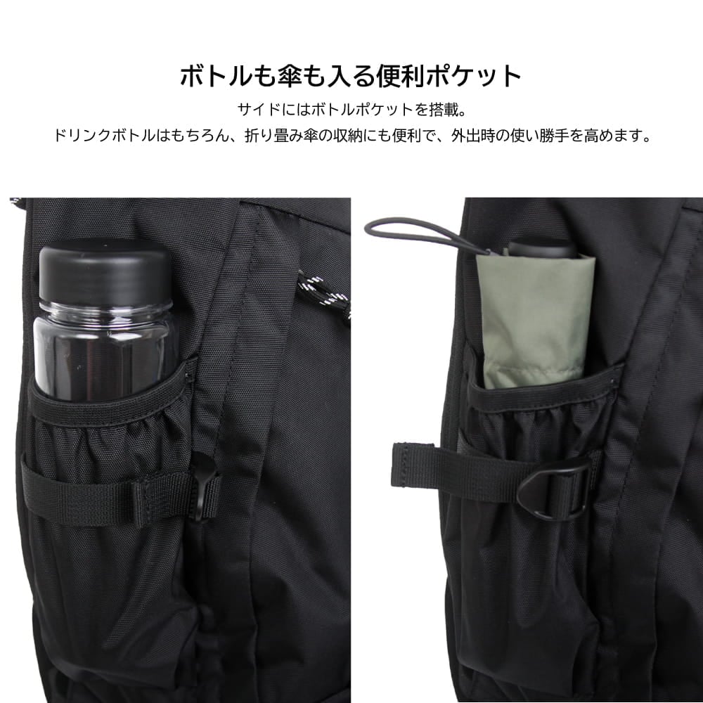 サイドにはボトルポケットを搭載し、ドリンクボトルはもちろん折り畳み傘の収納にも便利。