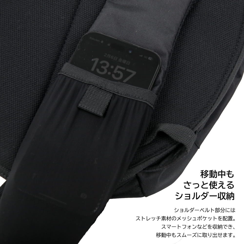 さらにショルダーベルト部分にはストレッチメッシュポケットを備え、スマートフォンなどをサッと取り出せます。